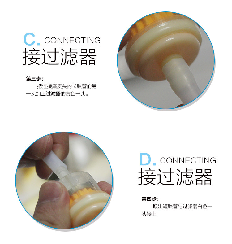 3. Προσθέστε το άλλο τέλος της μακριάς μάνικας που συνδέει τη λειαντική άκρη με το κίτρινο τέλος του φίλτρου